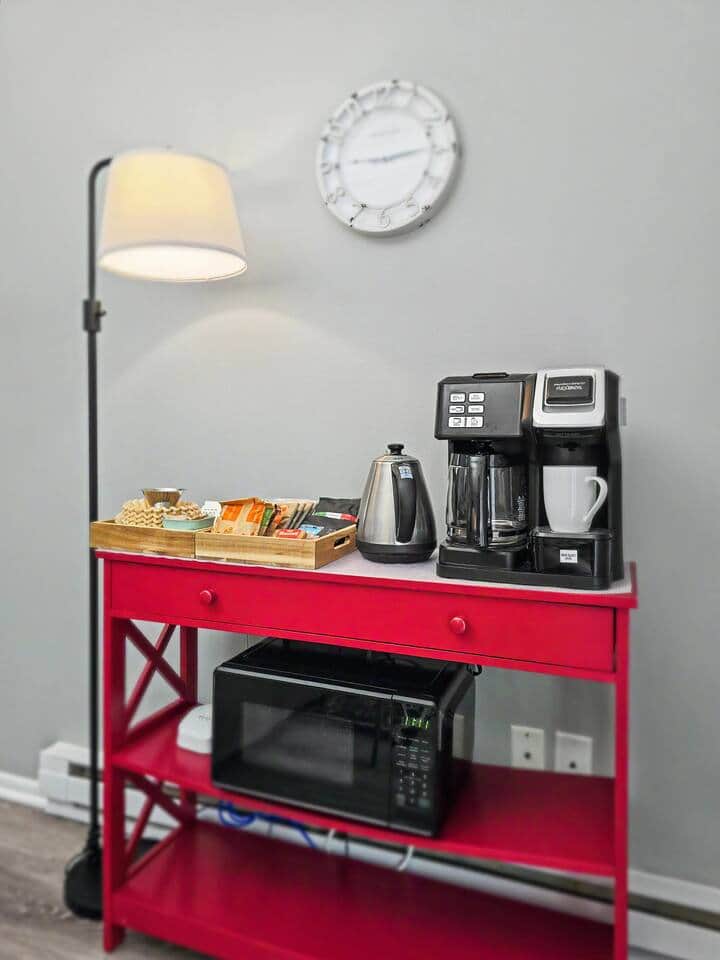Coffee machine, Cooking utensils, Kitchenette, Microwave, Oven, Refrigerator